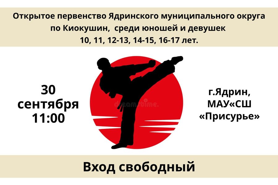 30 сентября 2023 года в 11:00 в МАУ «СШ «Присурье» пройдет открытое первенство Ядринского муниципального округа по Киокушин , среди юношей и девушек 10, 11, 12-13, 14-15, 16-17 лет.