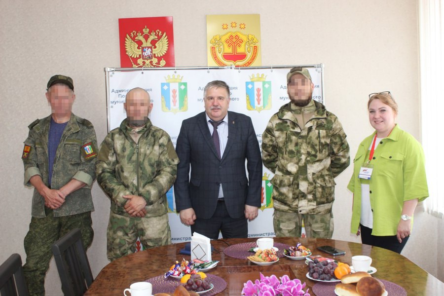 В Порецкий округ продолжают прибывать в краткосрочный отпуск участники специальной военной операции на Украине. Сегодня глава округа Евгений Лебедев встретился с военнослужащими, чей отпуск заканчивается 21 июня: Сергеем З., Романом О. и Михаилом Р.