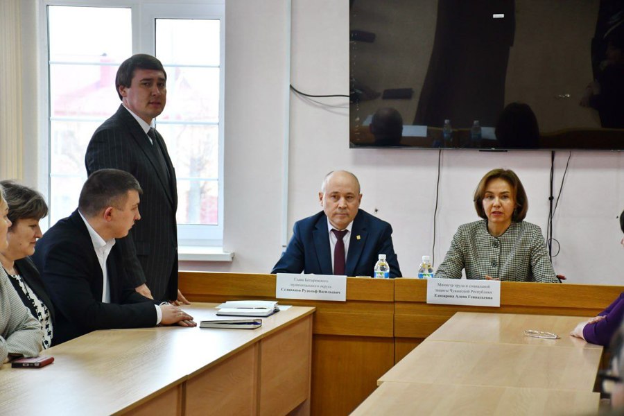 В рамках визита Алена Елизарова провела рабочее совещание с коллективом бюджетного учреждения «Батыревский центр социального обслуживания населения», в котором приняли участие глава Батыревского муниципального округа Рудольф Селиванов, заместитель начальника отдела компетенции по вопросам социального контракта КУ «Центр предоставления мер социальной поддержки» Минтруда Чувашии Наталия Никитина, начальник отдела КУ Центра занятости населения Чувашской Республики Минтруда Чувашии в Батыревском районе Марсель Сафиянов, директор БУ «Тарханский психоневрологический интернат» Минтруда Чувашии Наталия Дружинина.