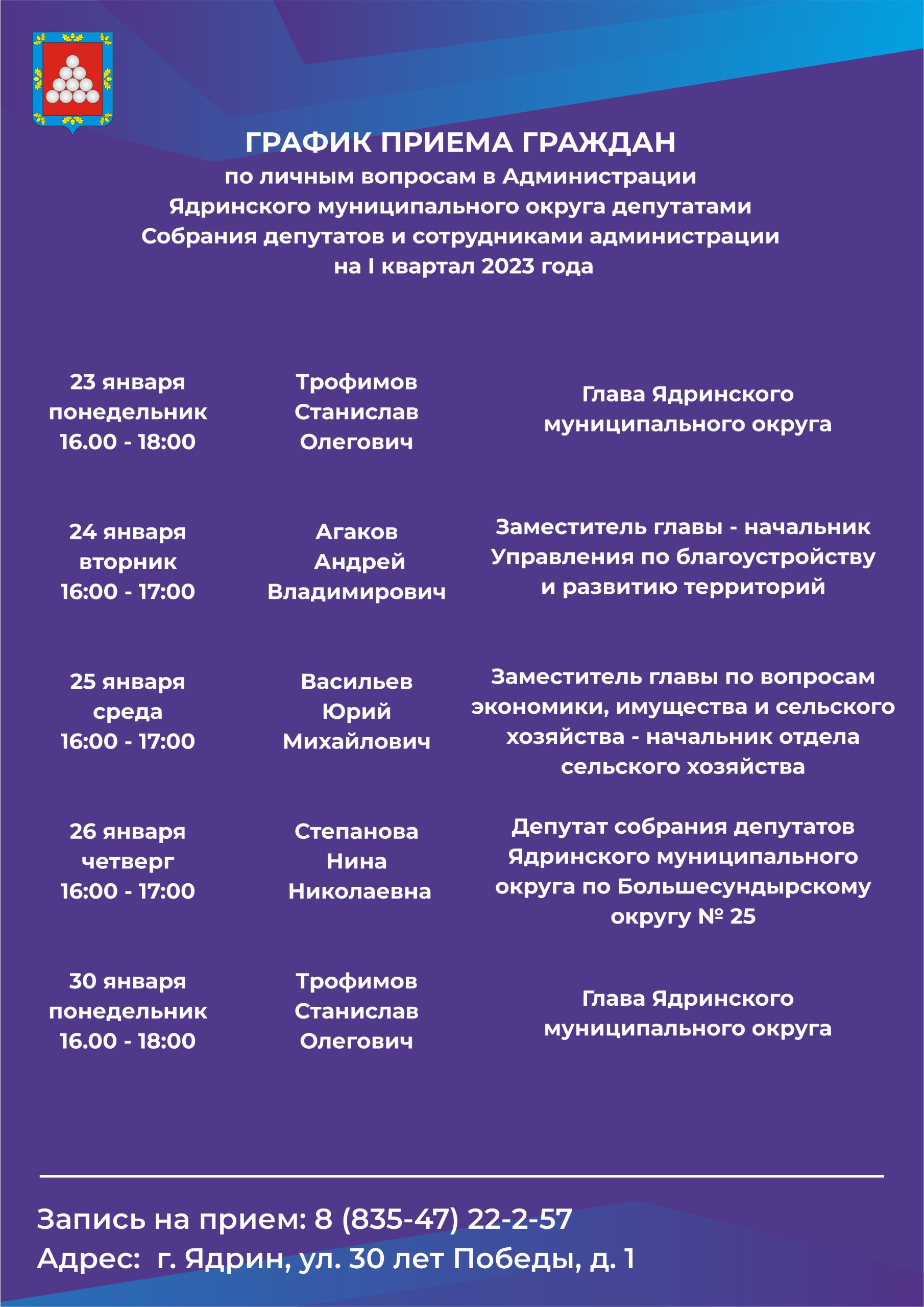 Приглашаем Вас на прием по личным вопросам в администрацию Ядринского муниципального округа,