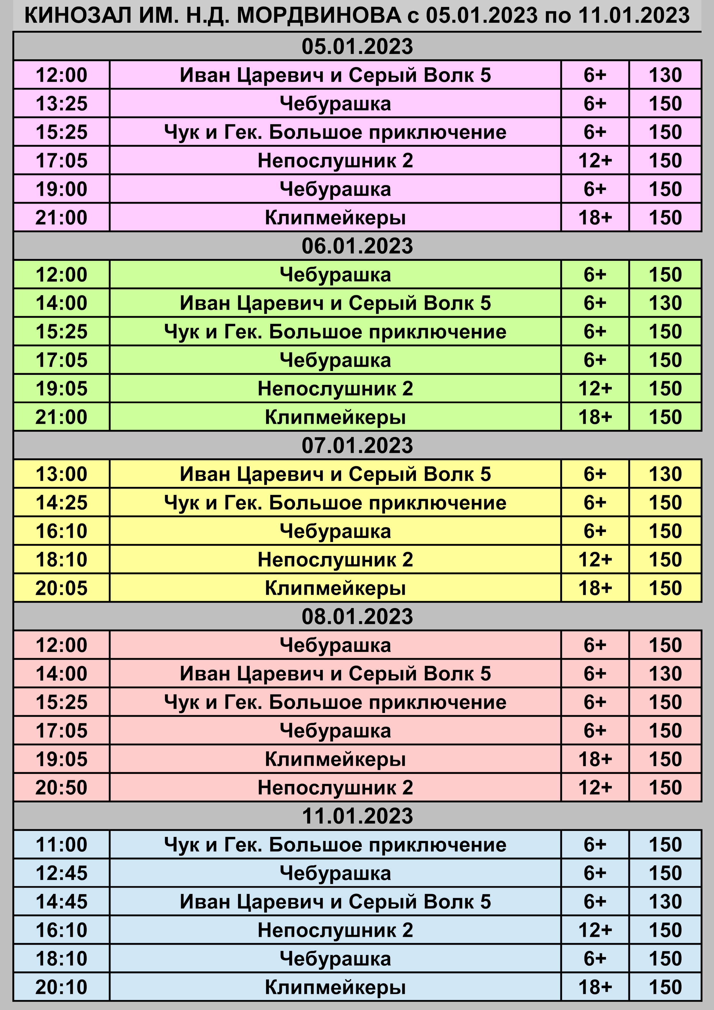 Расписание Кинозала им. Н. Д. Мордвинова с 5 по 11 января
