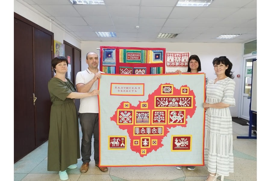 Вышитая карта Калужской области объединяет 16 фрагментов, вышитых 15 мастерами Клуба «Художественная вышивка» МБУ «Городской клуб ветеранов» города Обнинска.