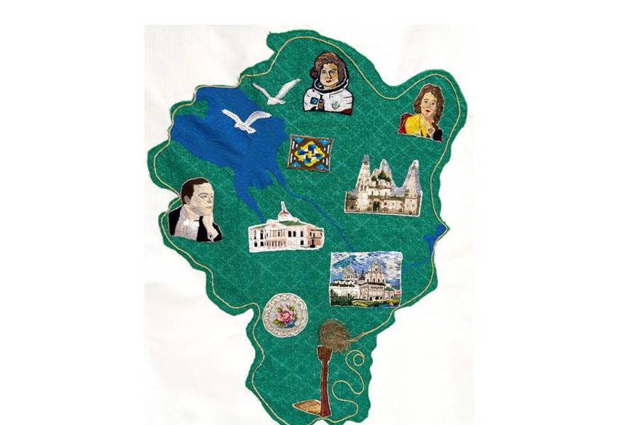 На вышитой карте области мы видим людей, прославивших Ярославскую землю: создателя первого русского профессионального театра Федора Волкова, оперного певца Леонида Собинова, первую в мире женщину-космонавта, легендарную «Чайку» Валентину Терешкову.