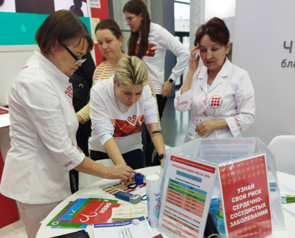 На стенде Чувашии можно было оценить риски развития сердечно-сосудистых заболеваний, узнать «возраст» сердца, измерить индекс массы тела, артериальное давление, силу мышц кисти, проверить оксигенацию крови.