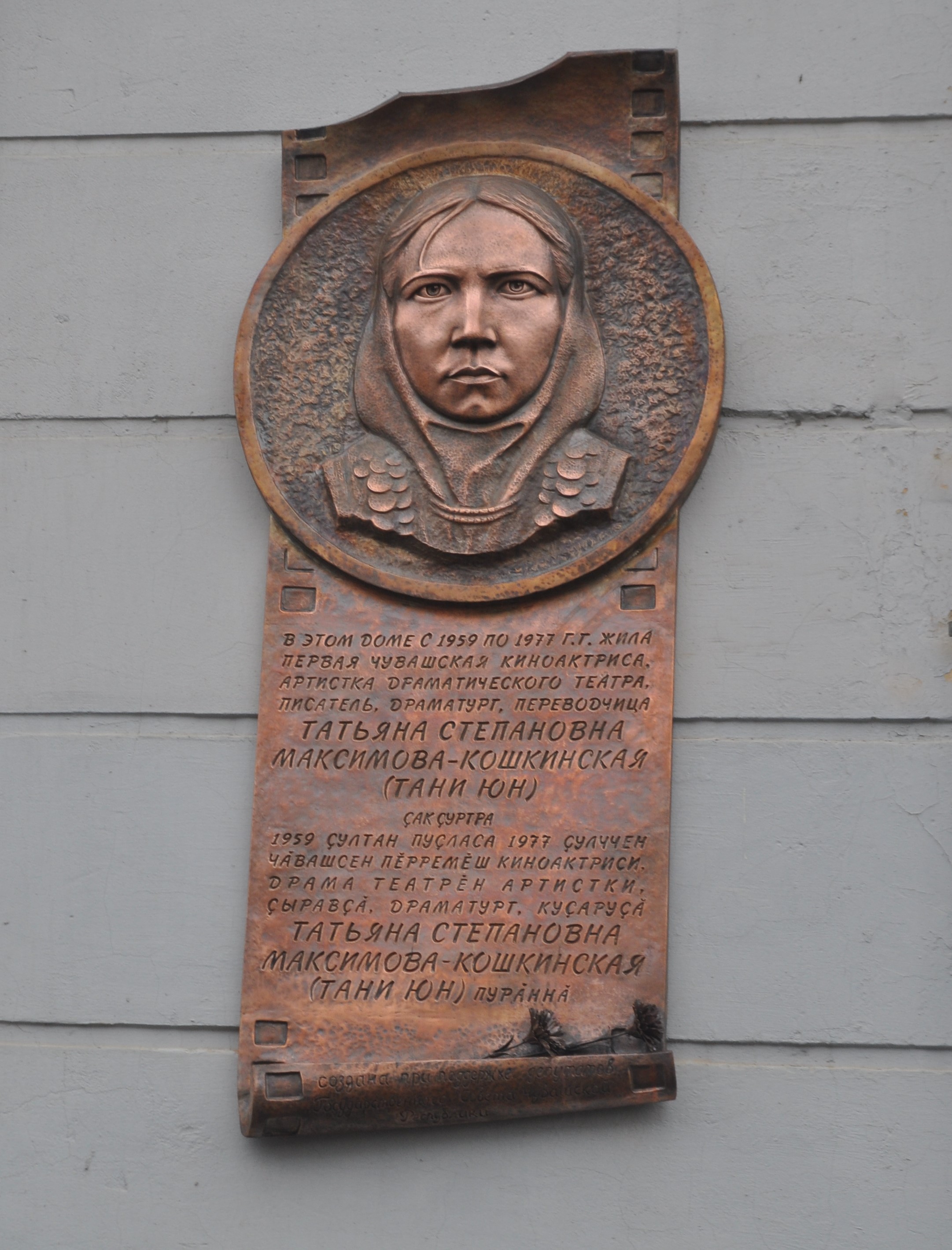 28 января в Чебоксарах открыли мемориальную доску в память знаменитой чувашской актрисы театра и кино Тани Юн. Памятный знак установлен на фасаде дома № 14 по проспекту Ленина, где она провела последние годы своей жизни вместе с мужем, основателем первого чувашского театра и «Чувашкино» Иоакимом Максимовым-Кошкинским .