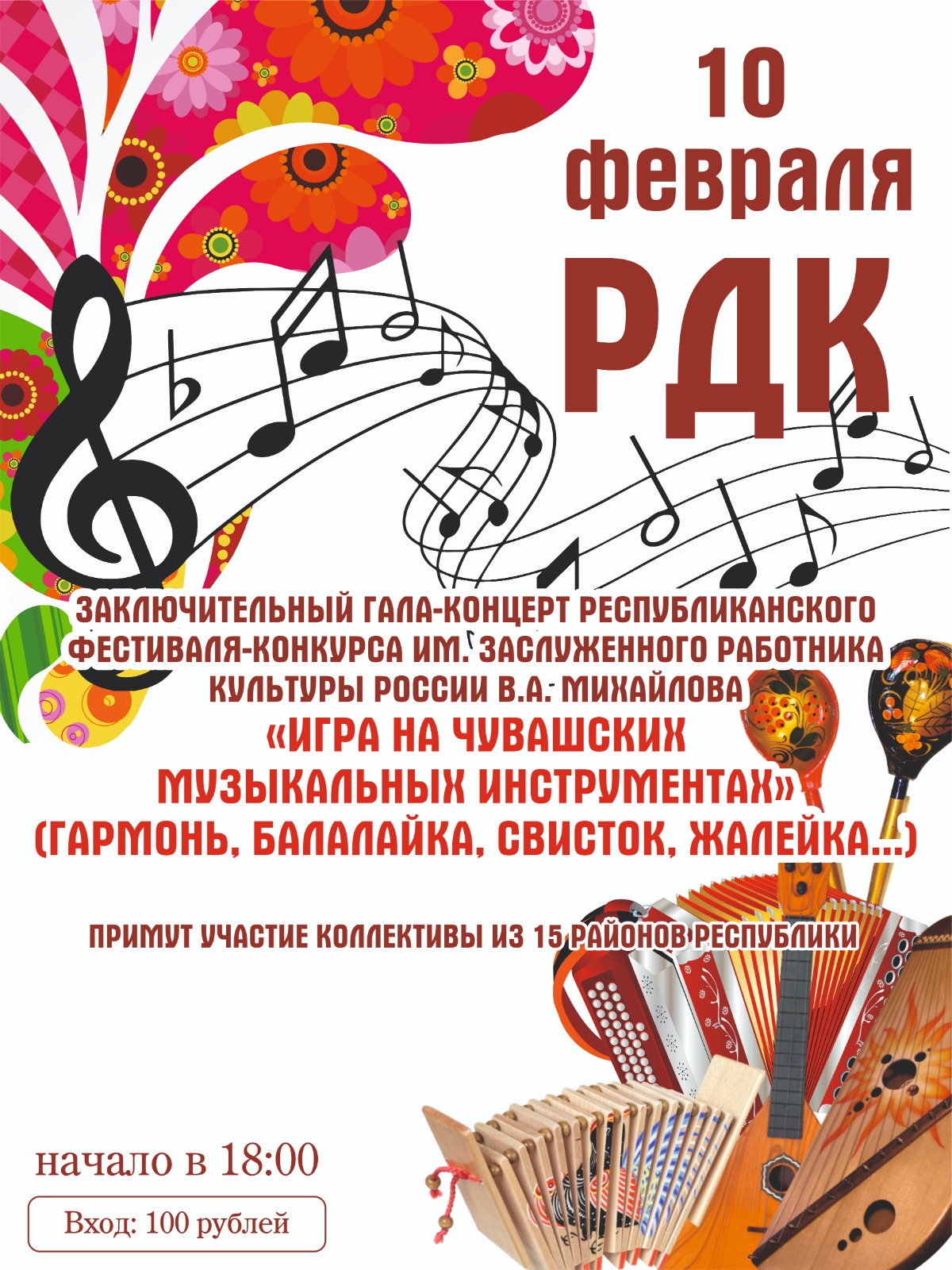 10 февраля 2023 года АУ «Республиканский центр народного творчества «ДК тракторостроителей» Минкультуры Чувашии совместно с администрацией Вурнарского муниципального округа проводит завершающий этап Республиканского фестиваля-конкурса исполнителей на чувашских народных музыкальных инструментах «Шăпăр-кĕсле, ай, янра!». Мероприятие посвящено памяти известного мастера-изготовителя чувашских народных музыкальных инструментов, заслуженного работника культуры Российской Федерации и Чувашской АССР Михайлова Владимира Антоновича.