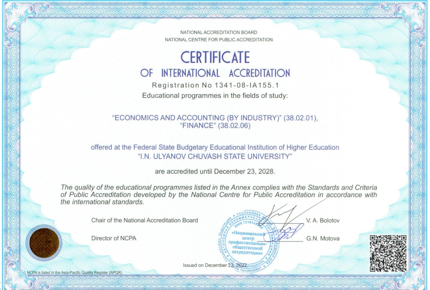 В итоге, Чувашский государственный университет имени И.Н. Ульянова вновь подтвердил качество реализуемых образовательных программ на международном уровне. Вуз получил свидетельства о профессионально-общественной аккредитации на русском и английском языках сроком на шесть лет и знак отличия «EXCELLENT QUALITY», свидетельствующий о высоком качестве образовательных программ, аккредитованных в соответствии с международными стандартами и требованиями рынка труда. По результатам международной профессионально-общественной аккредитации аккредитованным образовательным программам присвоен рейтинг «4 звезды». Университету предоставлено право разместить на официальном сайте знак отличия «EXCELLENT QUALITY» со ссылкой на Реестр аккредитованных программ Нацаккредцентра ( www.аккредитация.рф ).