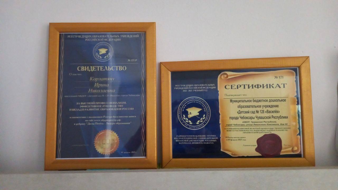 Столичные дошкольные учреждения, их руководители, педагоги, воспитанники ежегодно входят в число лучших. На основании независимой экспертной оценки и общественного мнения де тский сад № 128 г. Чебоксары является участником ведущих образовательных учреждений Российской Федерации и подтверждает надежность и качество образовательной деятельности. Заведующему вручено Свидетельство за высокий профессионализм, эффективное руководство и вклад в развитие образования России.