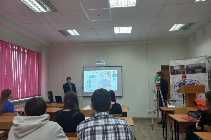 На мастер-классе для будущих землеустроителей и специалистов по кадастровой деятельности председатель ЧРО РГО И.В. Никонорова и доцент кафедры физической географии и геоморфологии В.Н. Ильин рассказали, как и для чего формируется Национальная система пространственных данных и какие геодезические приборы и дистанционные методы для этого используются.