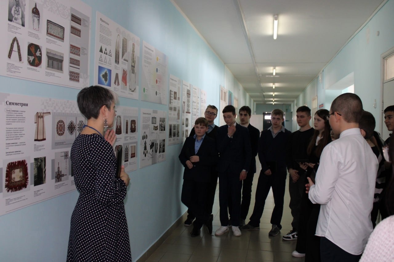 Экскурсовод республиканского КВЦ «Радуга» Анна Владимировна Фирсова провела экскурсии по выставке «Точные науки и этноискусство», полученной школой в дар. Обучающиеся 5-8 классов смогли взглянуть на чувашскую народную культуру с позиции школьных дисциплин: математика, химия, биология и народное искусство. Учащиеся узнали о применении чувашскими мастерицами математических феноменов.
