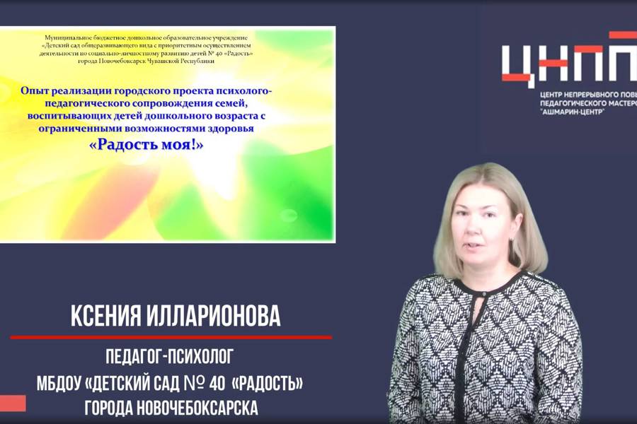 Педагог-психолог МБДОУ «Детский сад № 40 «Радость» г. Новочебоксарска Ксения Илларионова, лауреат VI республиканского Летнего фестиваля-конкурса практической психологии «Компетентный педагог – счастливый ребёнок», посвящённого Году педагога и наставника в Российской Федерации и Году счастливого детства в Чувашской Республике, представляет методическую разработку «Опыт реализации городского проекта психолого-педагогического сопровождения семей, воспитывающих детей дошкольного возраста с ограниченными возможностями здоровья «Радость моя!» .