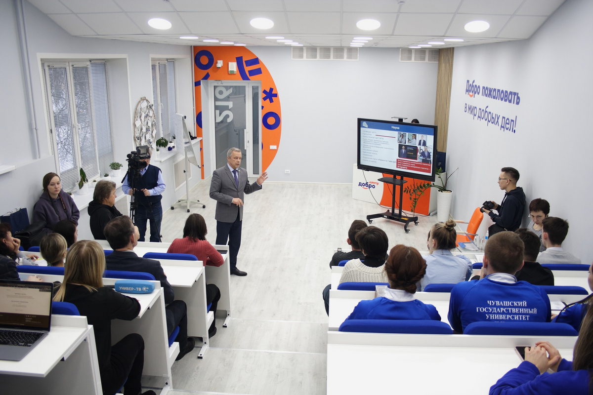 Встреча со студентами и представителями республиканских СМИ прошла в первом в Поволжье “ДоброЦентре”. Его тоже открыли в прошлом году. Днем в просторной современной аудитории проходят занятия, а вечером волонтеры собираются здесь, чтобы обсудить новые добровольческие инициативы.