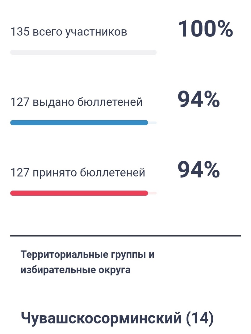135 заявок на участие в ДЭГ подано от избирателей Аликовского округа. В настоящее время из них 127 проголосовали, что составляет 94 % от числа зарегистрированных.
