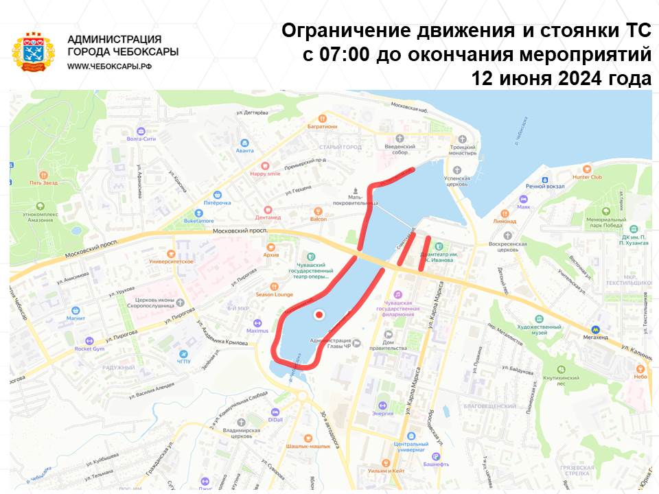 12 июня, в День России в связи с проведением массовых мероприятий на Красной площади будет ограничено движение и стоянка для всех видов транспортных средств в районе Чебоксарского залива.