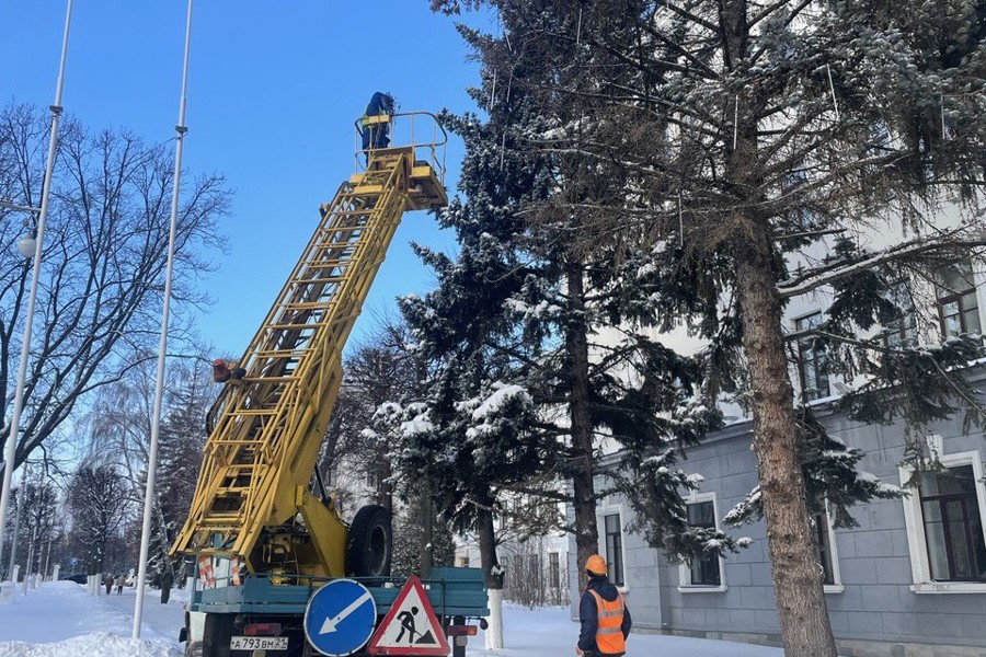 Установлена и оформлена гирляндами живая ель на площади перед железнодорожным вокзалом; искусственная ель на площадке перед кинотеатром «Мир Луксор»; ель возле дома Правительства по Президентскому бульвару;живая ель в микрорайоне Садовый .