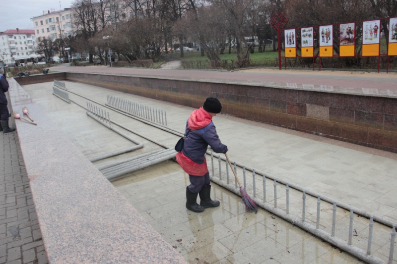 Команда, которую мы застали рядом с памятником легендарному герою Гражданской войны, перемещается от одного фонтана к другому, по мере выполнения работ. При этом часть сооружений(например, сооружение у монумента Матери) были почищены ранее.