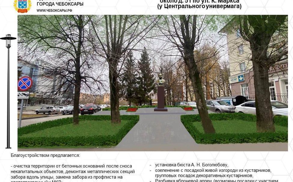 В центре Чебоксар планируется установка памятника уроженцу города, Герою Советского Союза, генерал-полковнику Александру Боголюбову.