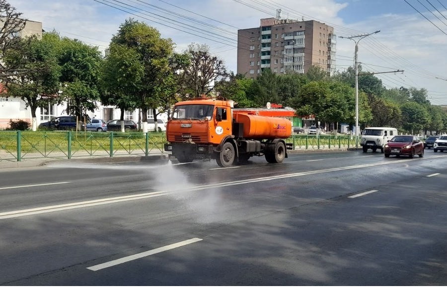 В связи с жаркой погодой (+25°С и выше) дорожники АО «Дорэкс» проводят комплексную поливку проезжей части на дорогах города Чебоксары.