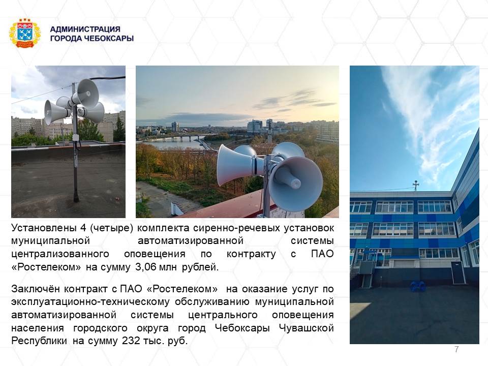 На подпрограмму "Защита населения и территории от чрезвычайных ситуаций природного и техногенного характера, обеспечение пожарной безопасности и безопасности населения на водных объектах на территории города Чебоксары" из бюджетов всех уровней были предусмотрены 3,3 млн рублей. В рамках данной программы установлены 4 комплекта сиренно-речевых установок, заключен контракт на техническое обслуживание системы оповещения на сумму 232 тысяч рублей.