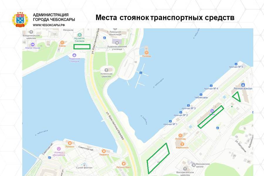 Места стоянок транспортных средств вблизи обустроенных купелей будут предусмотрены по следующим адресам: 1)Нижняя площадка пл.Речников; 2)в районе д.№1-3 по пл. Речников, 3) памятника Екатерины II; 4) памятника Петру и Февронии