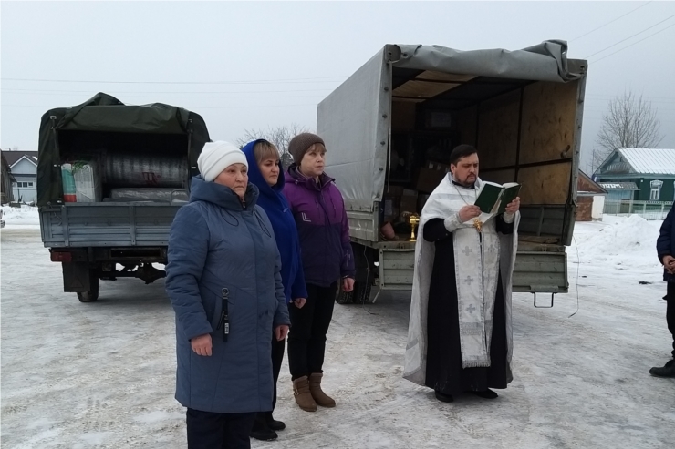 Настоятель храма Казанской иконы Божией Матери с. Луцкое Комсомольского района иерей Сергий Скворцов благословил водителей, сопровождающих, и освятил гуманитарную помощь.