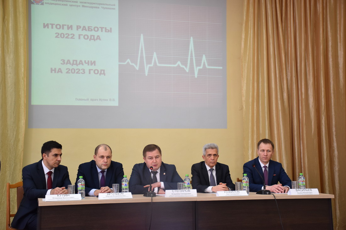 17 февраля состоялось отчетное собрание по итогам деятельности Шумерлинского межтерриториального медицинского центра за 2022 год. В мероприятии приняли участие вице-премьер Правительства Чувашской Республики – министр здравоохранения Владимир Степанов, заместитель министра Сергей Тоцкий, директор территориального фонда обязательного медицинского страхования Чувашской Республики Максим Дроздов.