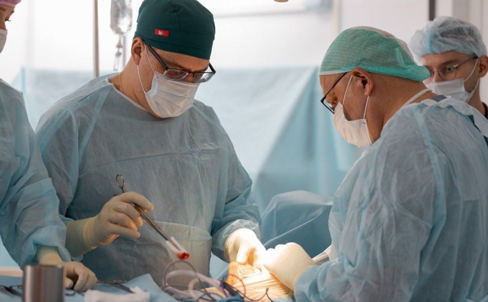 Операция длилась четыре часа. Первым этапом сосудистый хирург кардиодиспансера произвел резекцию аневризмы и имплантировал искусственный протез в аорто-бедренную позицию. Далее операцию продолжила бригада онкодиспансера. Хирурги выполнили аппаратурную низкую переднюю резекцию прямой кишки, в результате которой извлекли опухоль диаметром 8 см, практически полностью перекрывающую просвет кишки.