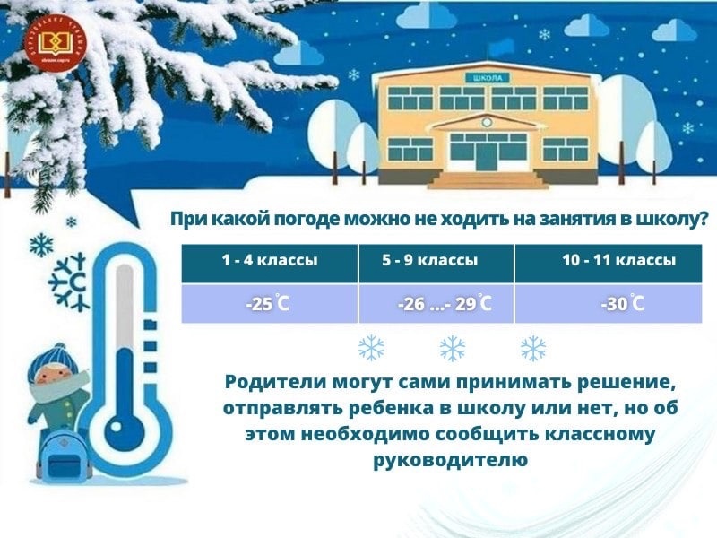 • При температуре ниже - 25 градусов отменяются занятия для учащихся 1-4 классов;