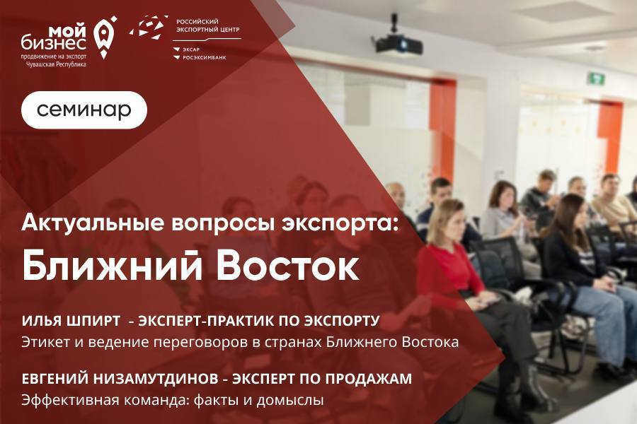Уже в этот четверг, 14 декабря, состоится бесплатный семинар для потенциальных и уже действующих экспортеров, на котором можно будет узнать об особенностях этикета и ведения переговоров в странах Ближнего Востока, а также получить практические советы по созданию продуктивной команды. Встречу с экспертами проводит Центр поддержки экспорта Чувашии в рамках нацпроектов «Малое и среднее предпринимательство и поддержка индивидуальной предпринимательской инициативы» и «Международная кооперация и экспорт».