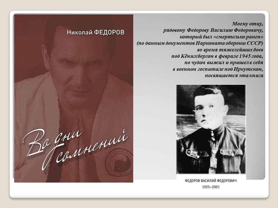 29 мая в Национальной библиотеке Чувашской Республики состоится презентация и церемония передачи новой книги сенатора Российской Федерации, Первого Президента Чувашии Николая Федорова «Во дни сомнений» в дар библиотекам республики. Книга посвящена памяти отца, фронтовика, рядового Василия Федоровича Федорова (1925-2001), который был «смертельно ранен» (как сообщалось в документах Наркомата обороны СССР) во время тяжелейших боев под Кёнигсбергом в феврале 1945 года, но чудом выжил и пришел в себя в военном госпитале под Иркутском.
