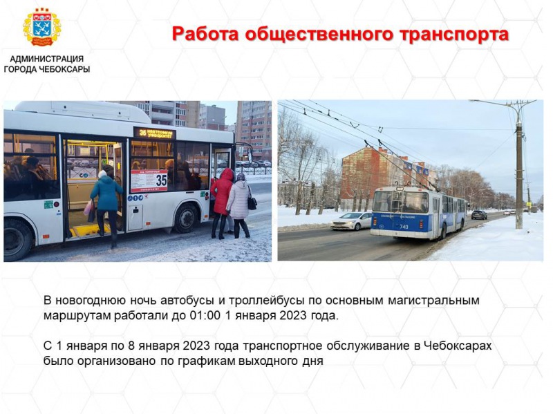 В праздничные дни работа общественного транспорта в городе Чебоксары была скорректирована. В новогоднюю ночь автобусы и троллейбусы по основным магистральным маршрутам работали до 1:00 1 января 2023 года. С 1 января по 8 января 2022 года транспортное обслуживание в Чебоксарах было организовано по графикам выходного дня.