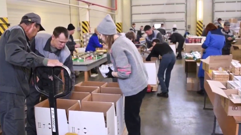 В каждую из двух тысяч продуктовых коробок вошли мясные и молочные консервы, сырокопченые колбасы, сухое молоко, чай, кофе, сладости, крупы, макароны и другие продукты длительного хранения.